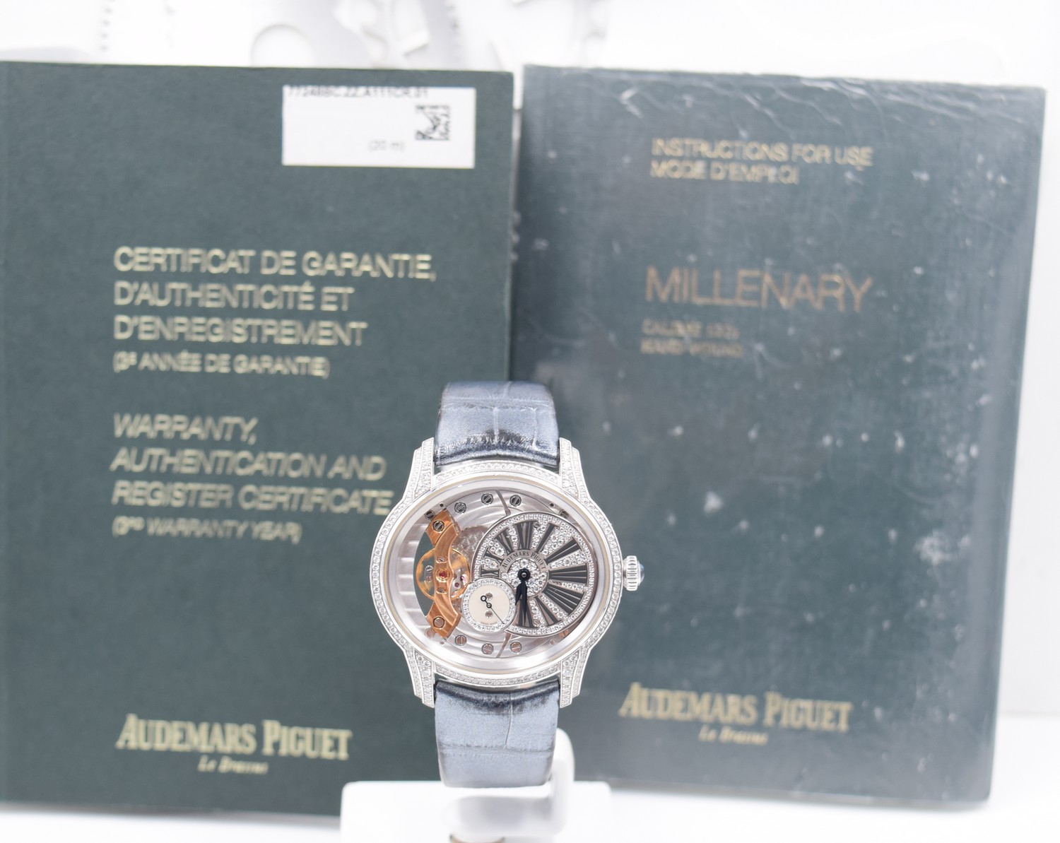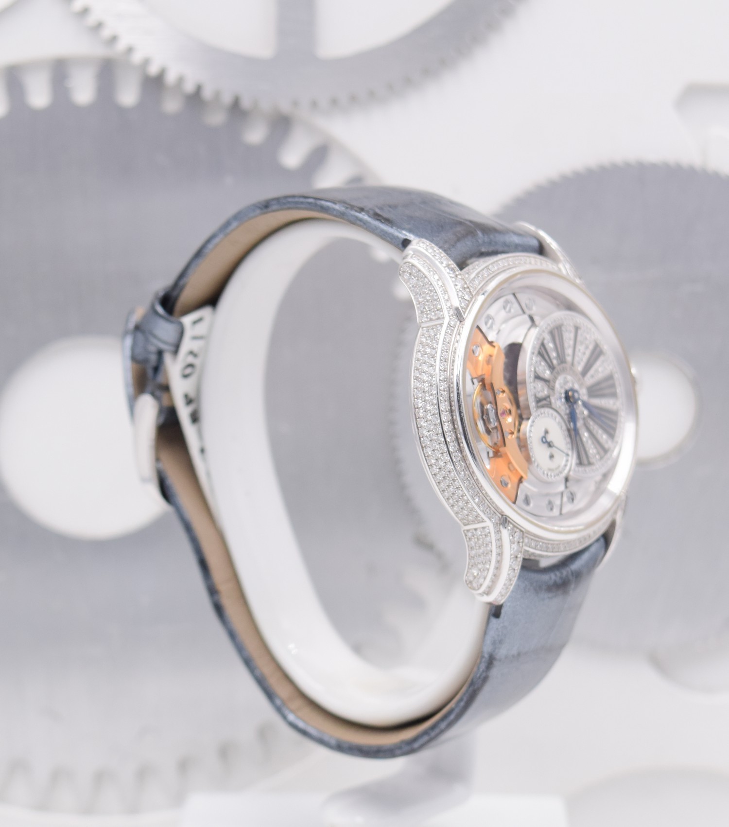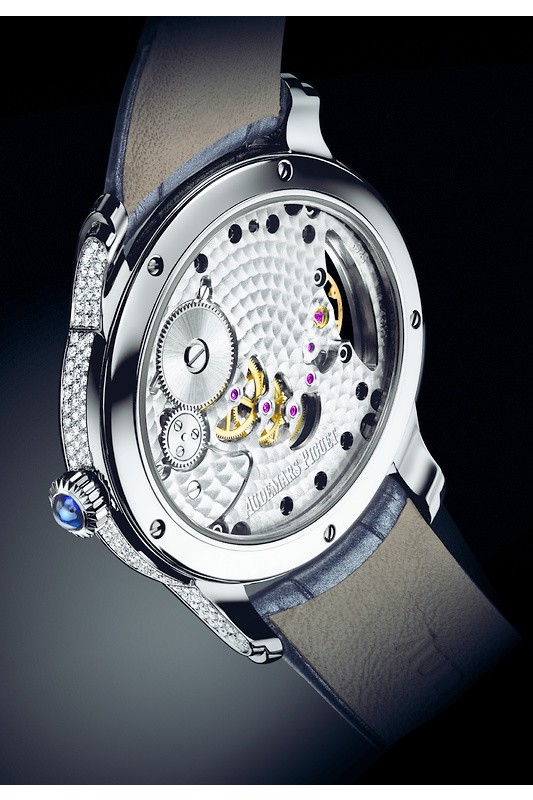 Boîtier en or gris 18 carats, entièrement serti de diamants. Glace et fond saphir avec traitement anti-reflets. Couronne sertie d’un saphir cabochon bleu. Diamètre 39,5 x 35,4 mm. Disque décentré en or gris, pavé de diamants. Chiffres romains décalqués anthracites. Compteur petite seconde en nacre blanche avec anneau serti, aiguilles en or bleui. Heures, minutes, petite seconde. Bracelet en alligator anthracite perlé à « grande écaille carrée » avec boucle ardillon en or gris 18 carats sertie. Calibre Manufacture 5201 à remontage manuel. 19 pierre, 157 composants, réserve de marche minimum garantie 54 h. Fréquence du balancier 3 Hz (= 21’600 alternances/heure). Dimensions totales 28,59 x 32,74 mm (12 ½ x 14 ½ lignes), épaisseur totale 4,16 mm. 438 diamants taille brillant ; ~1,93 carats (boîte, boucle). 136 diamants taille brillant ; ~0,26 carat (cadran).