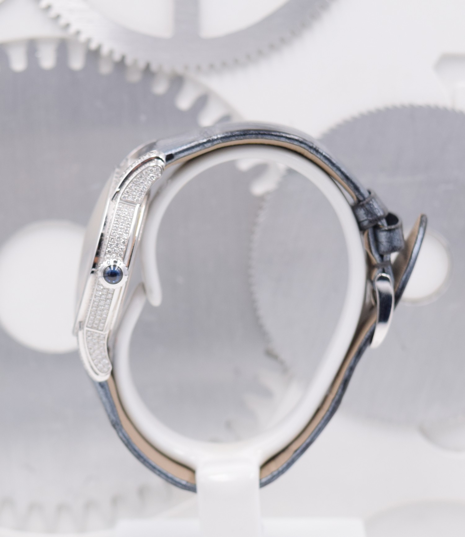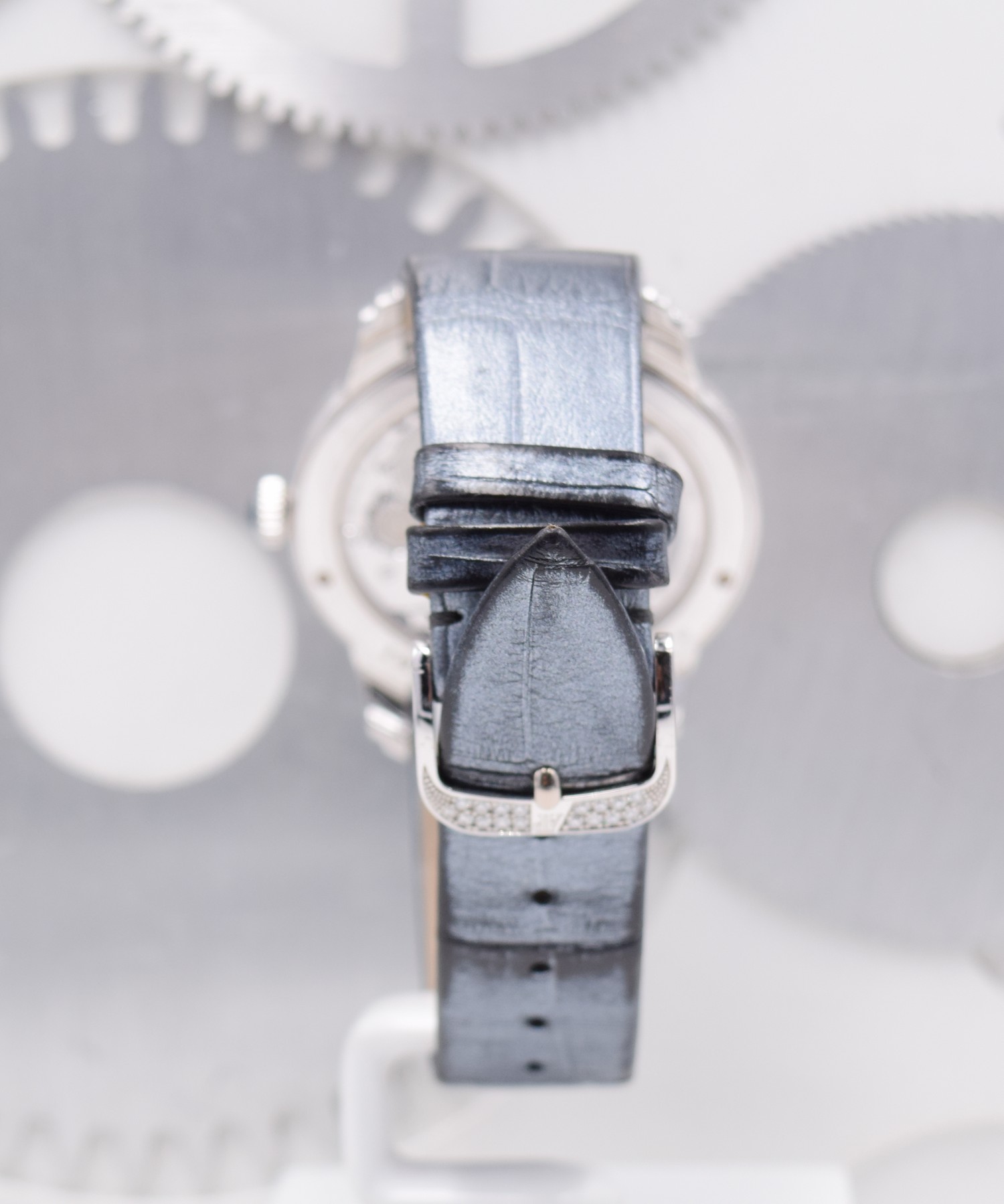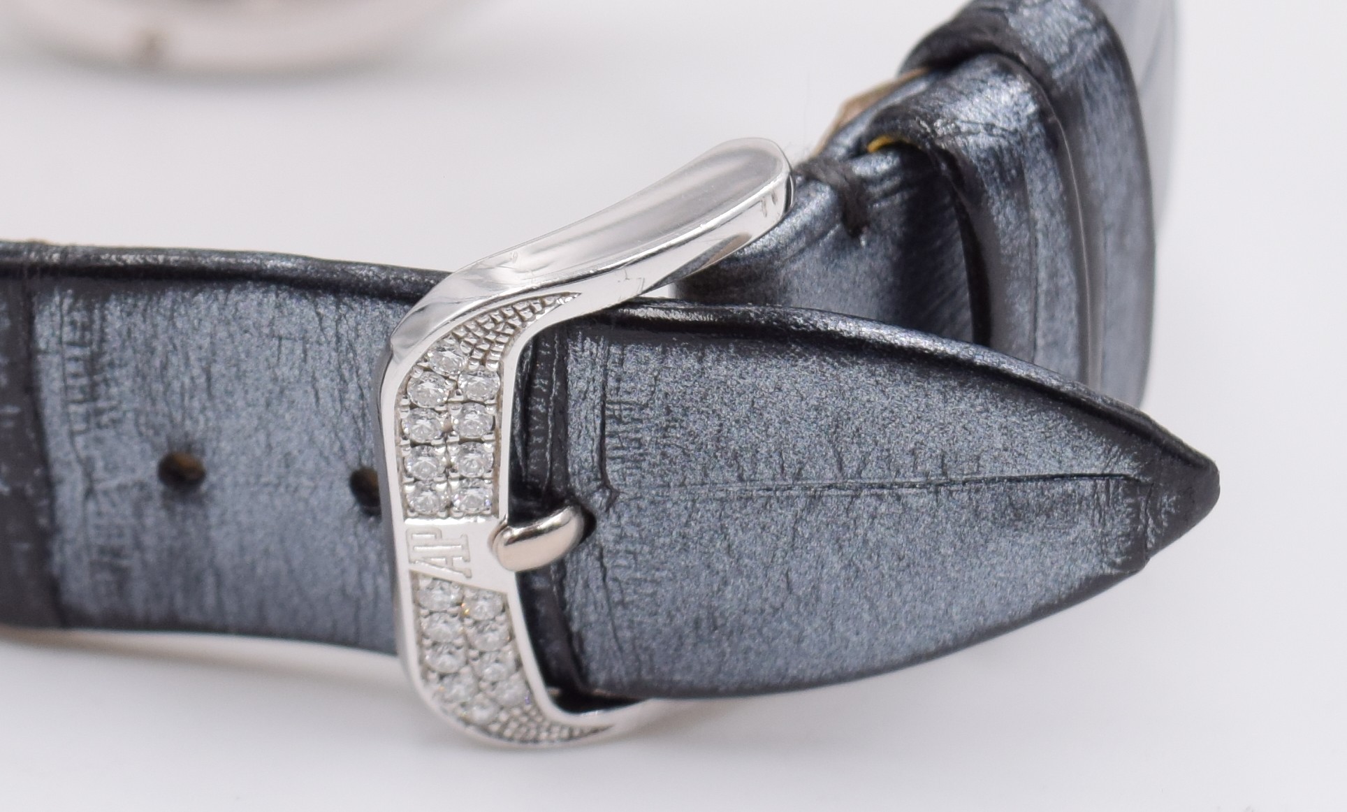Boîtier en or gris 18 carats, entièrement serti de diamants. Glace et fond saphir avec traitement anti-reflets. Couronne sertie d’un saphir cabochon bleu. Diamètre 39,5 x 35,4 mm. Disque décentré en or gris, pavé de diamants. Chiffres romains décalqués anthracites. Compteur petite seconde en nacre blanche avec anneau serti, aiguilles en or bleui. Heures, minutes, petite seconde. Bracelet en alligator anthracite perlé à « grande écaille carrée » avec boucle ardillon en or gris 18 carats sertie. Calibre Manufacture 5201 à remontage manuel. 19 pierre, 157 composants, réserve de marche minimum garantie 54 h. Fréquence du balancier 3 Hz (= 21’600 alternances/heure). Dimensions totales 28,59 x 32,74 mm (12 ½ x 14 ½ lignes), épaisseur totale 4,16 mm. 438 diamants taille brillant ; ~1,93 carats (boîte, boucle). 136 diamants taille brillant ; ~0,26 carat (cadran).