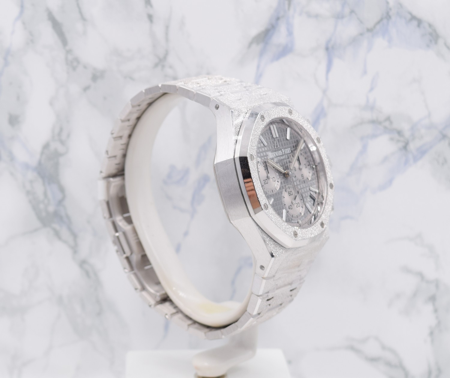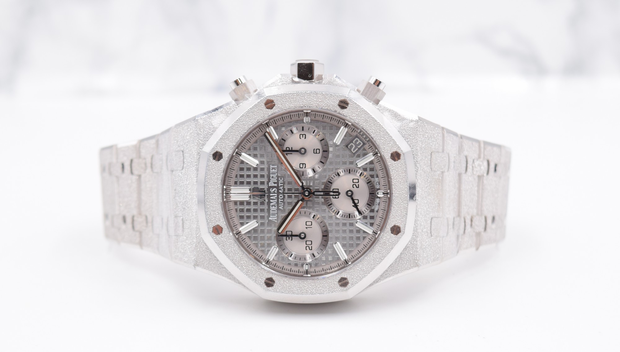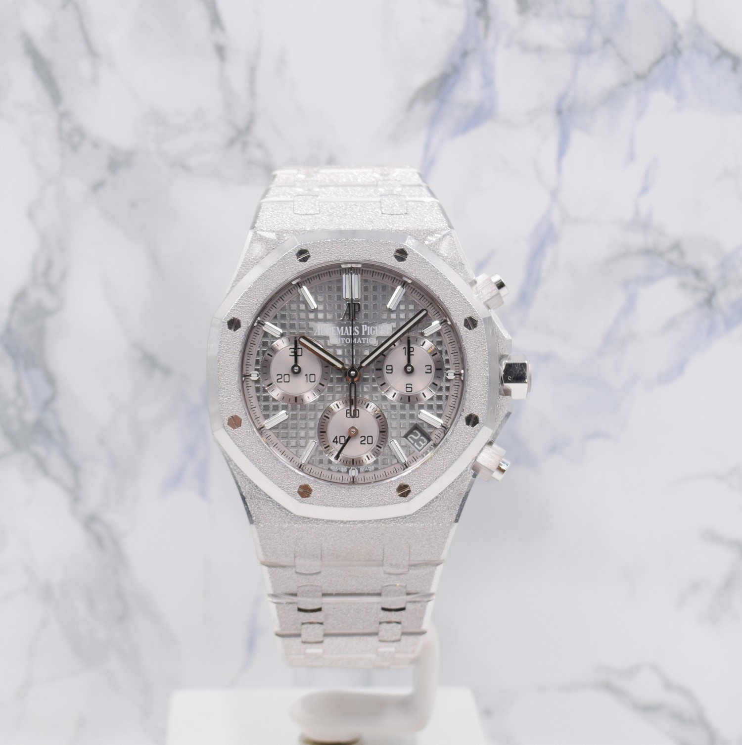 Cette édition limitée en or gris 18 carats aux finitions Frosted Gold est complétée par un cadran Tapisserie gris clair et équipée du mouvement chronographe dernière génération, Calibre Automatique 4401.