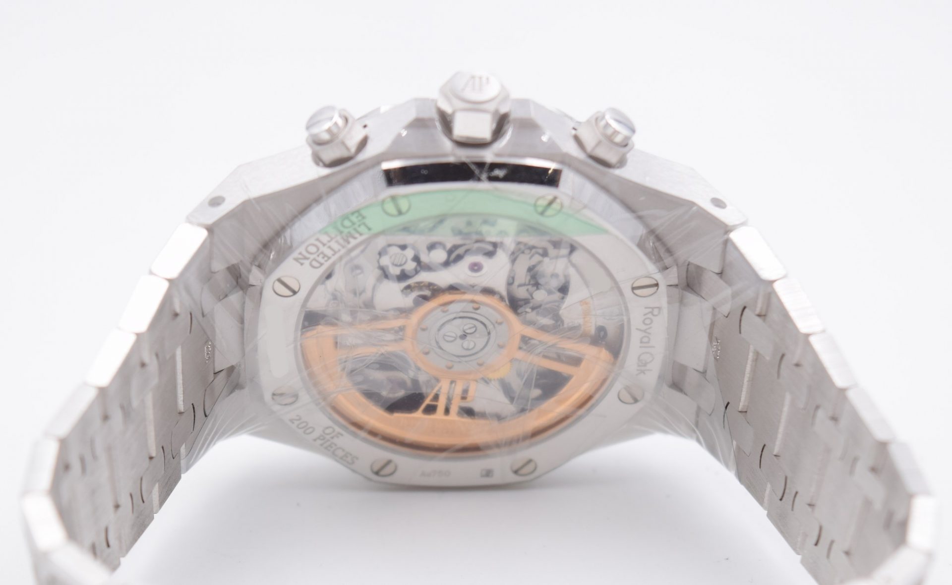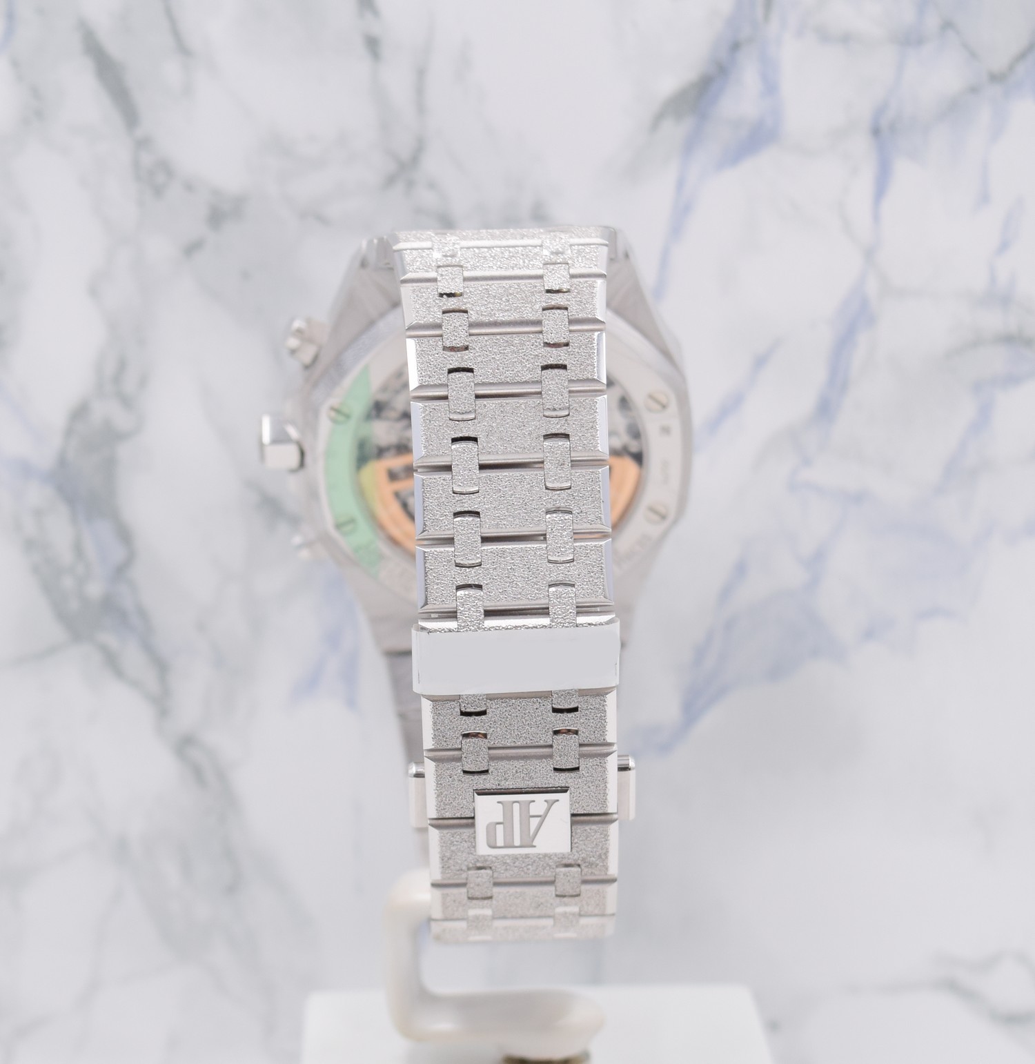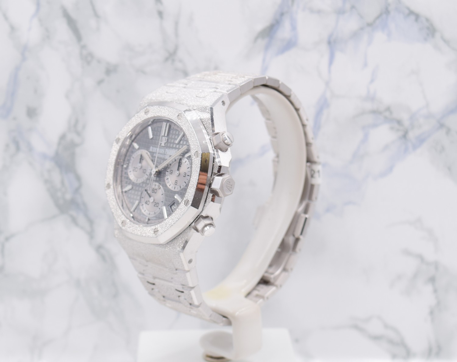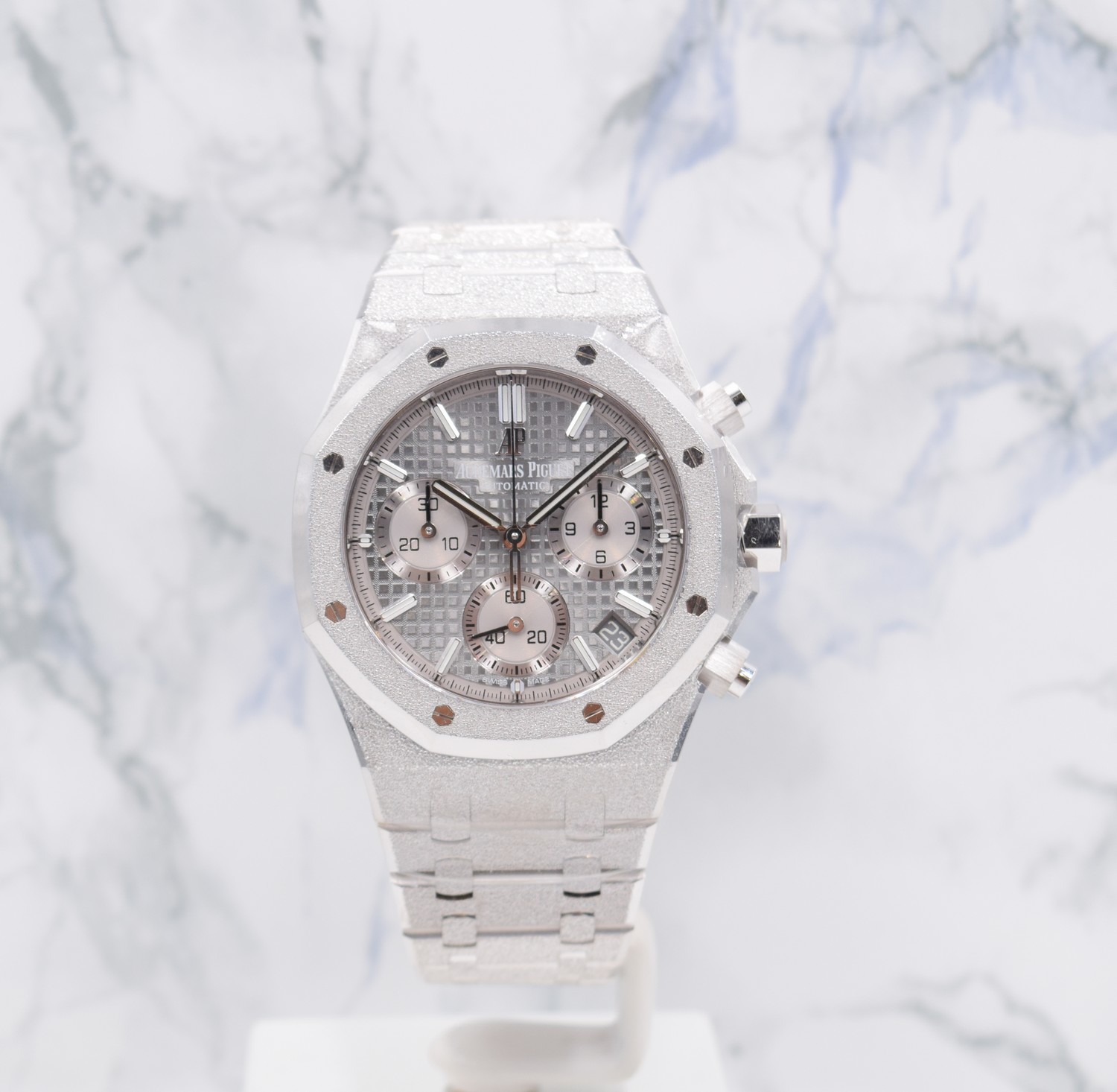 Cette édition limitée en or gris 18 carats aux finitions Frosted Gold est complétée par un cadran Tapisserie gris clair et équipée du mouvement chronographe dernière génération, Calibre Automatique 4401.
