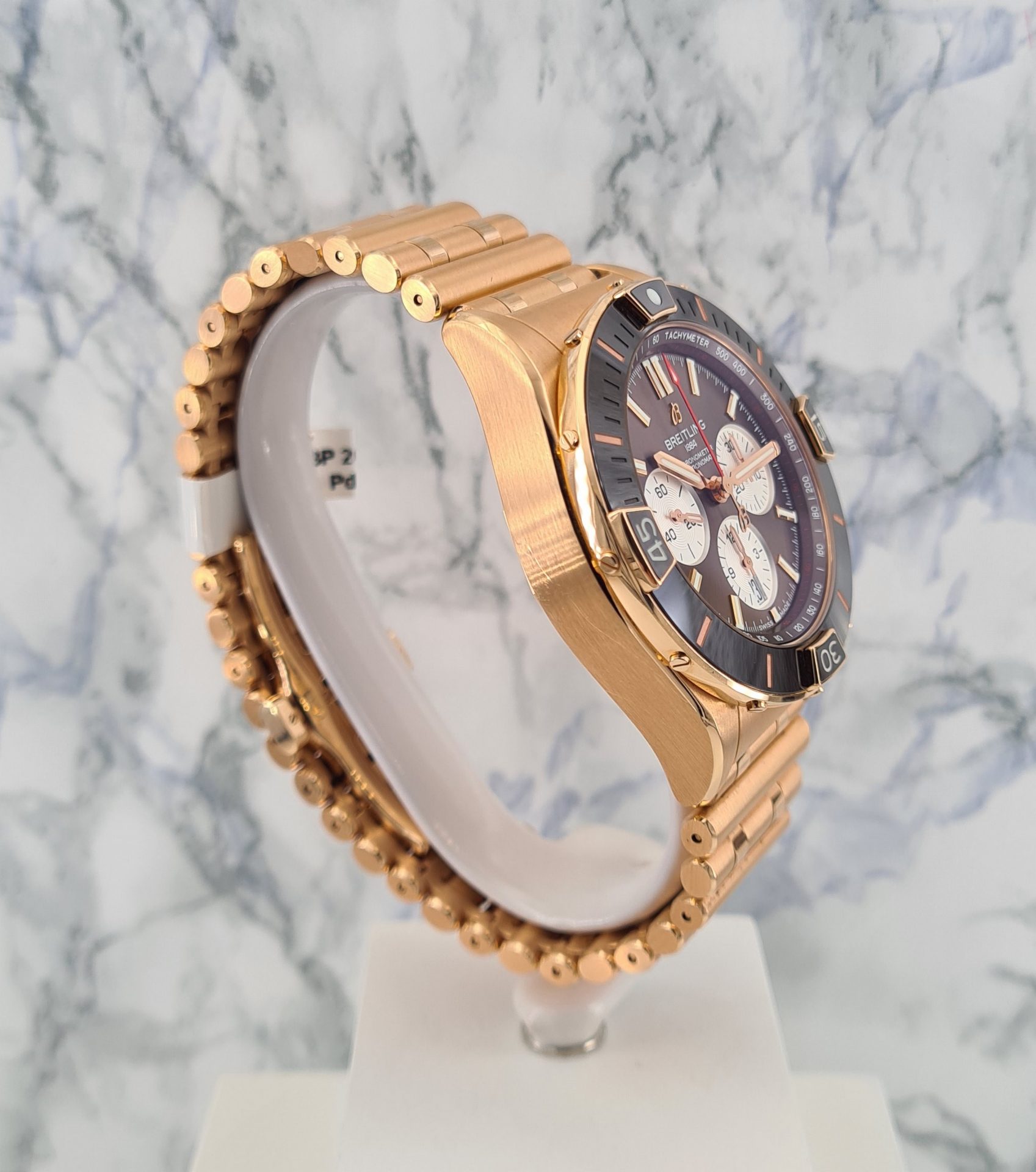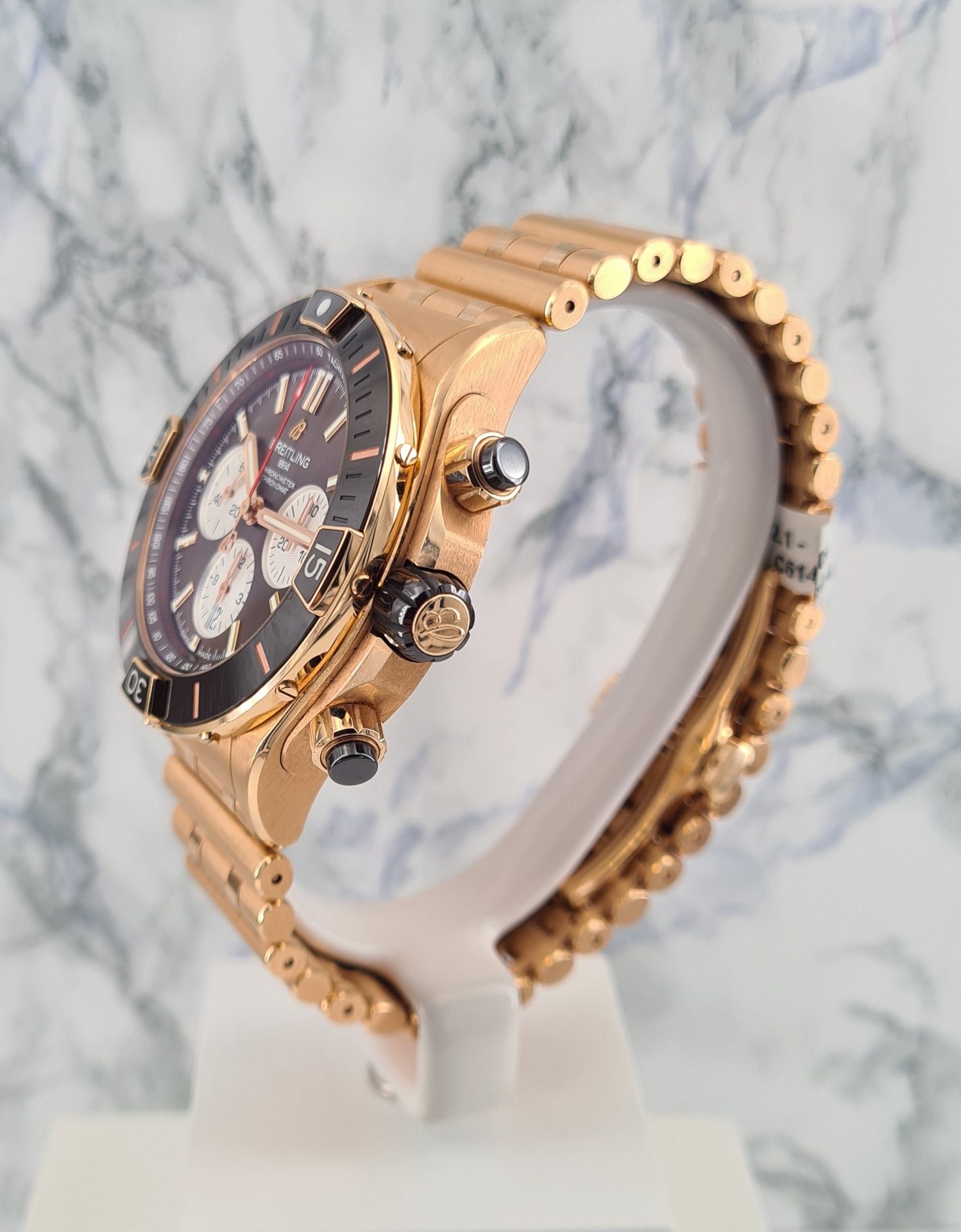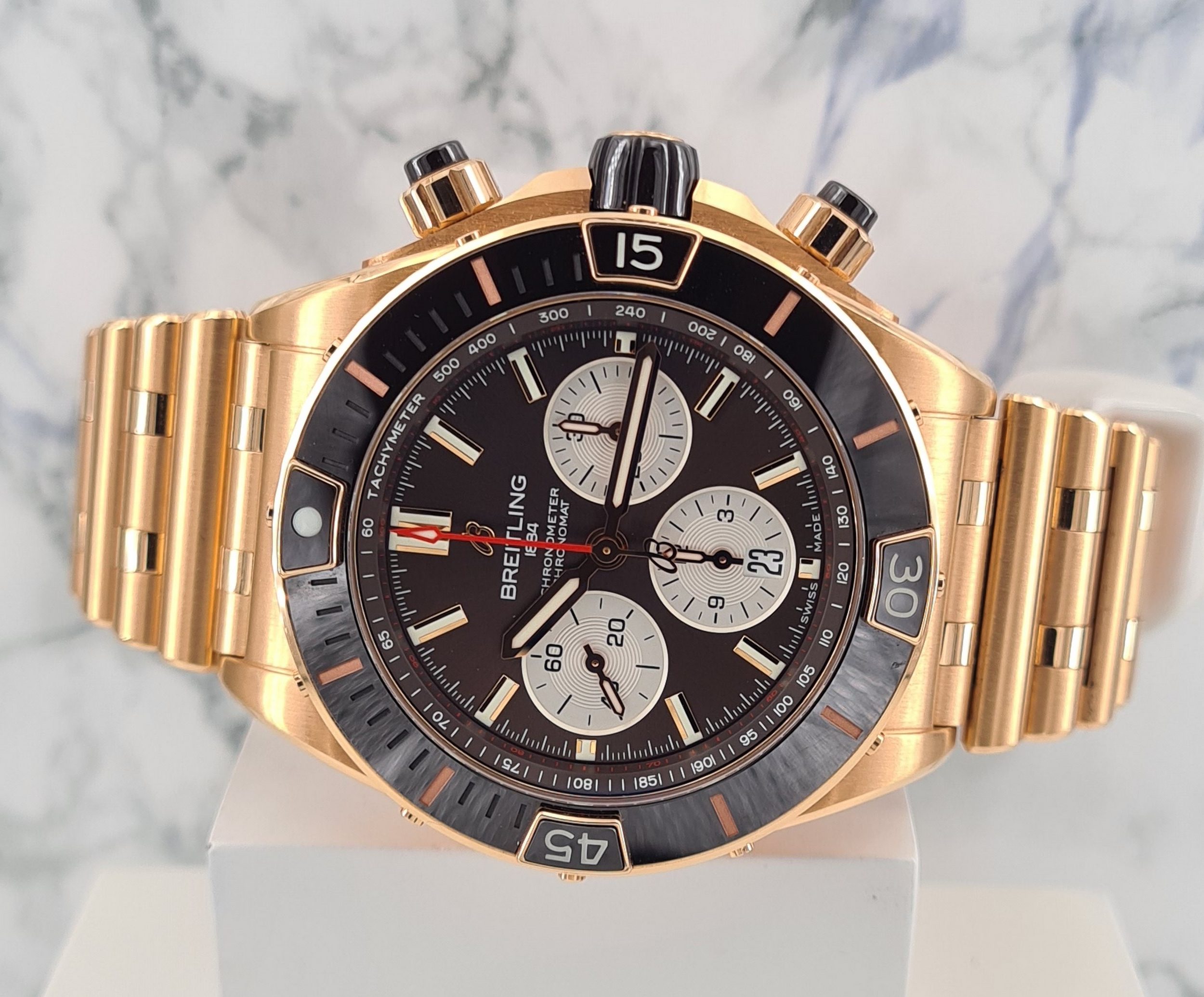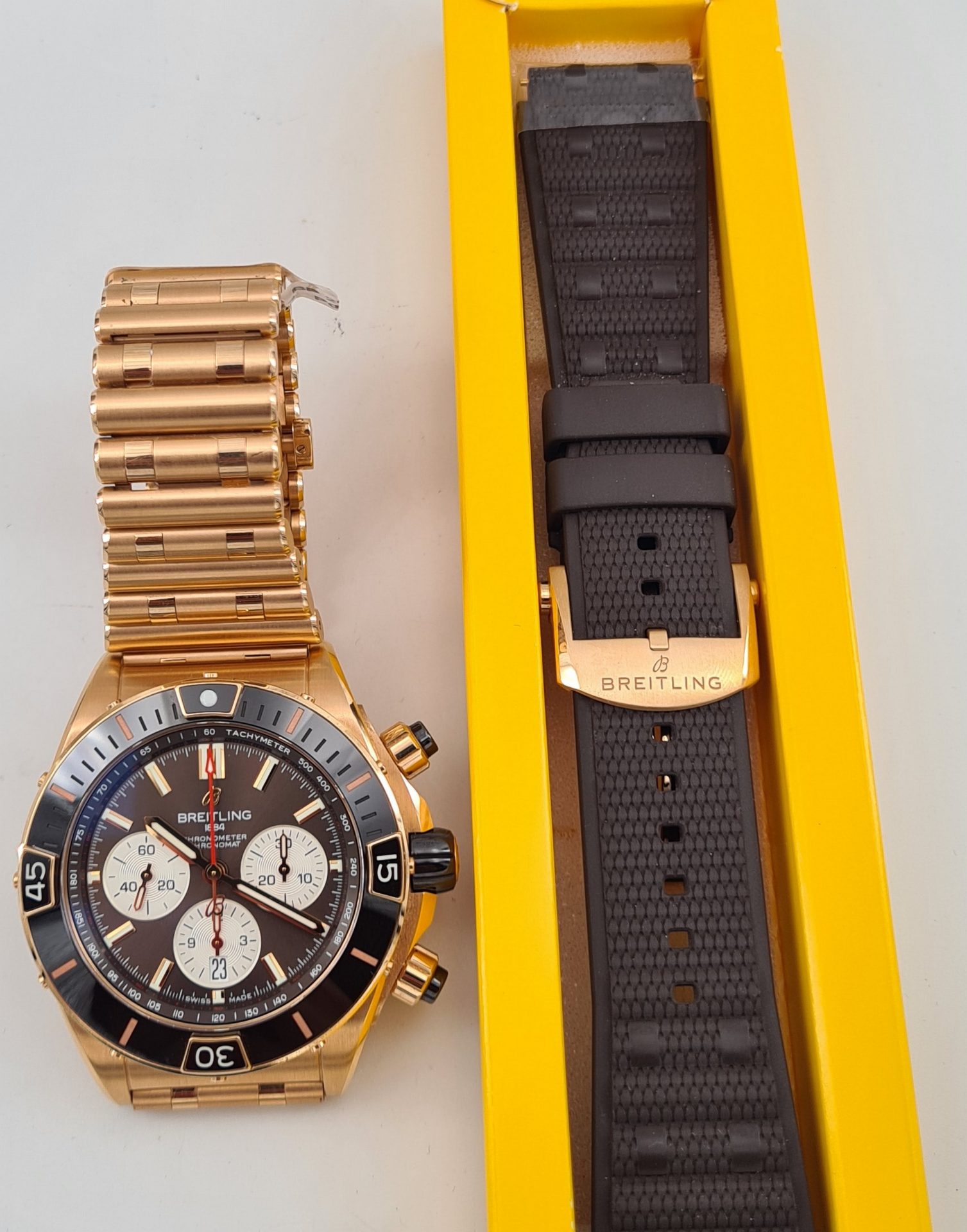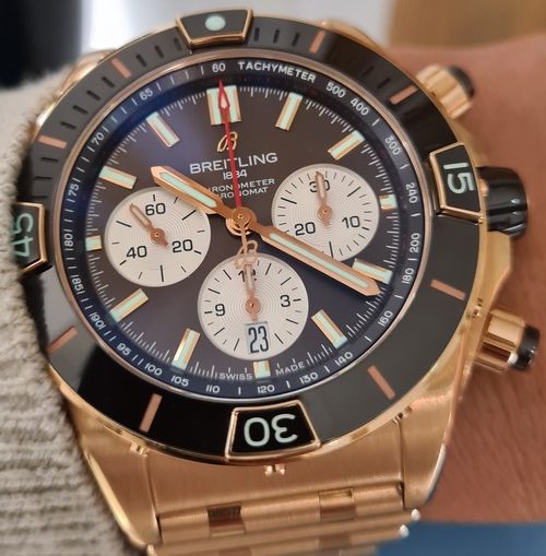 La Super Chronomat est inspirée de la Chronomat originale des années 1980, créée par Breitling pour les pilotes des patrouilles aériennes. La Super Chronomat est dotée de plusieurs inserts en céramique sur la lunette, les poussoirs de chronographe et la couronne ainsi que d’un bracelet en caoutchouc d’inspiration Rouleaux.