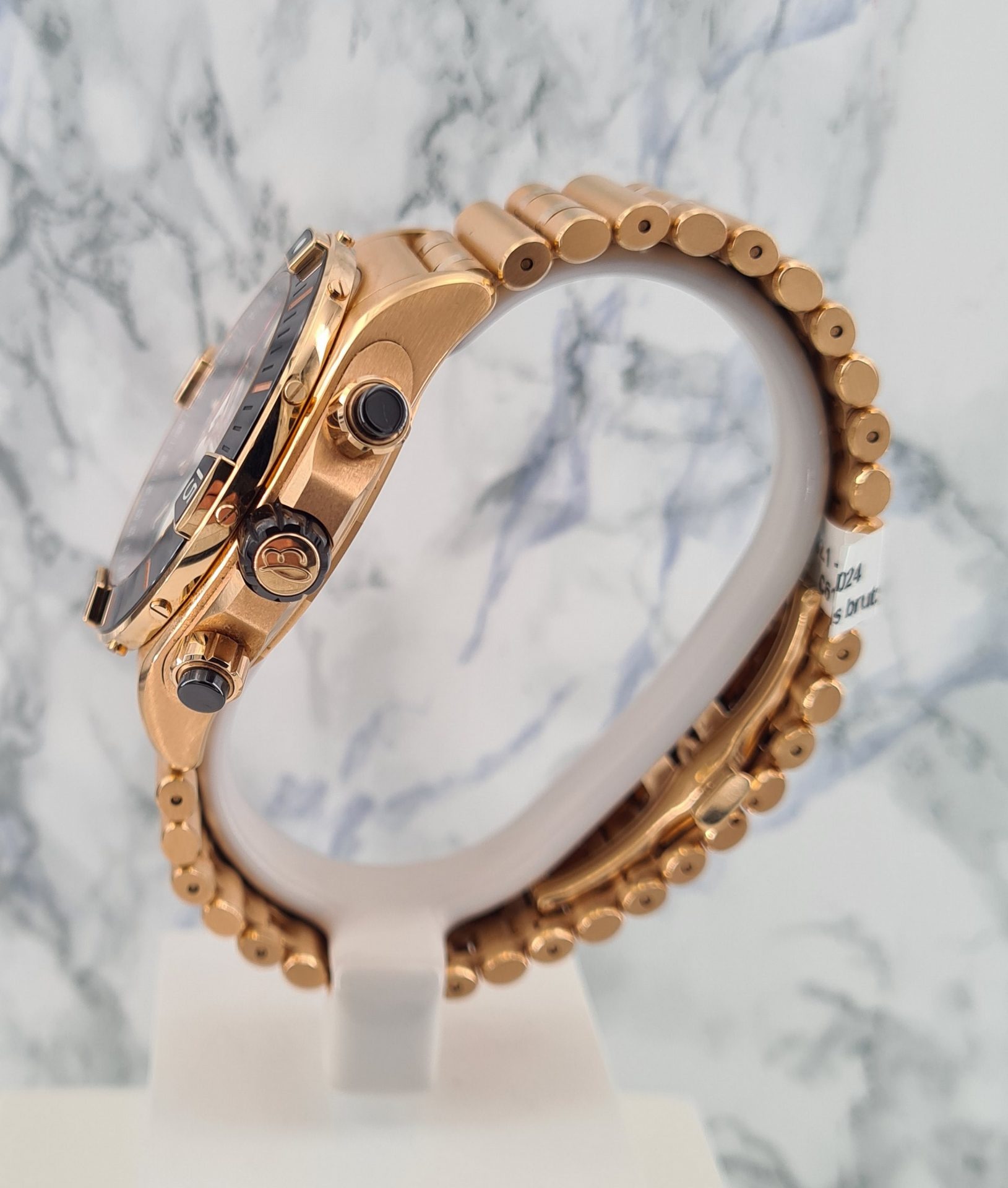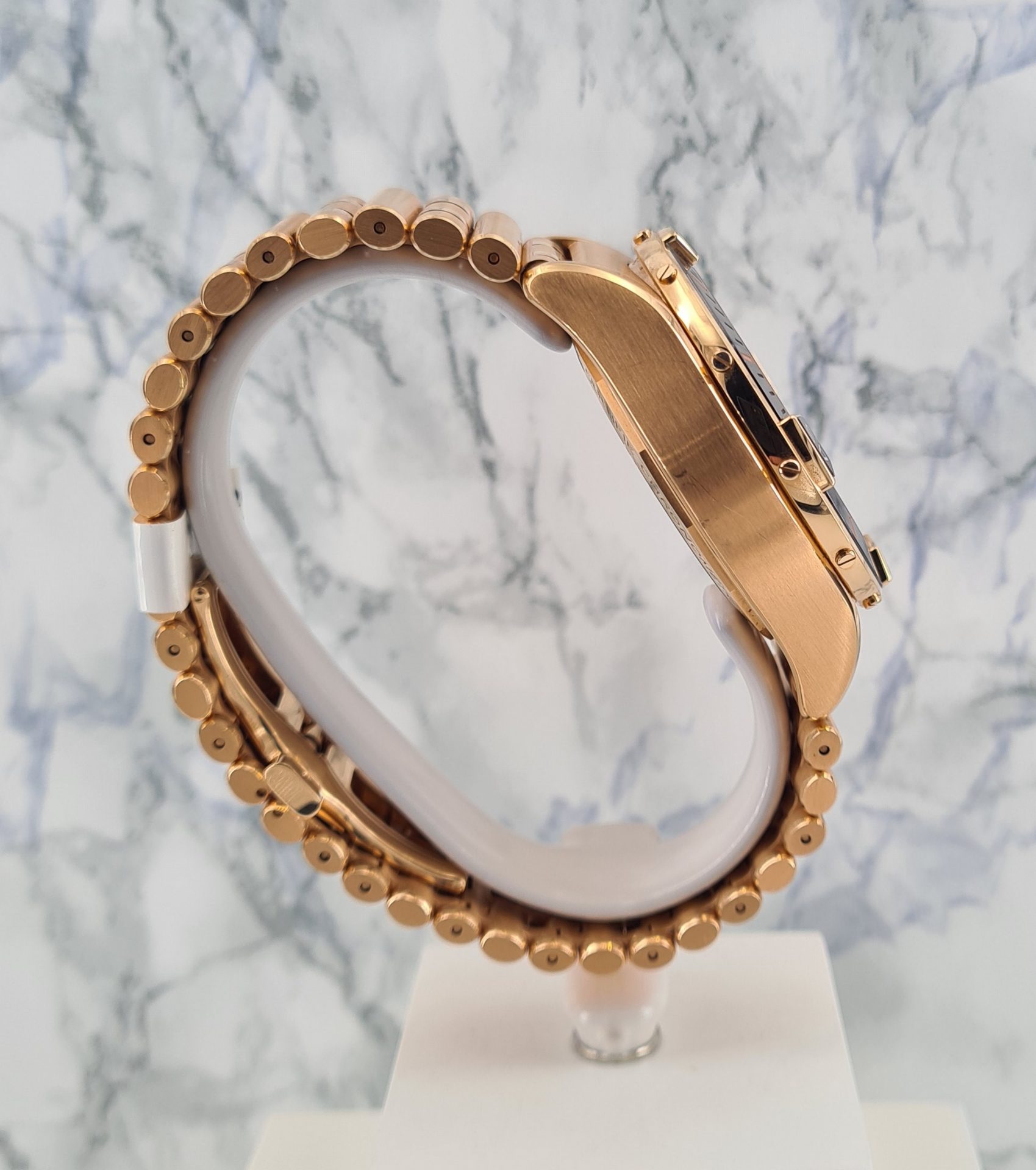 Montre livrée avec un bracelet supplémentaire en caoutchouc sur boucle déployante or rose.
