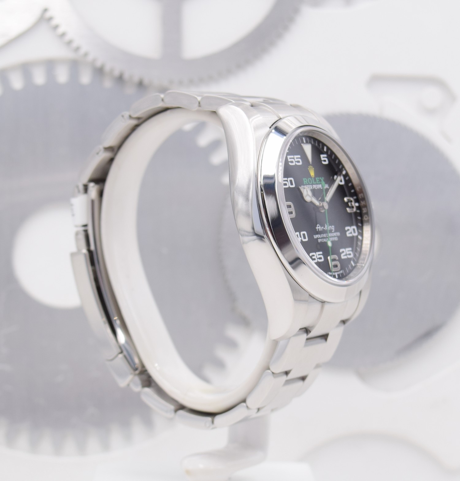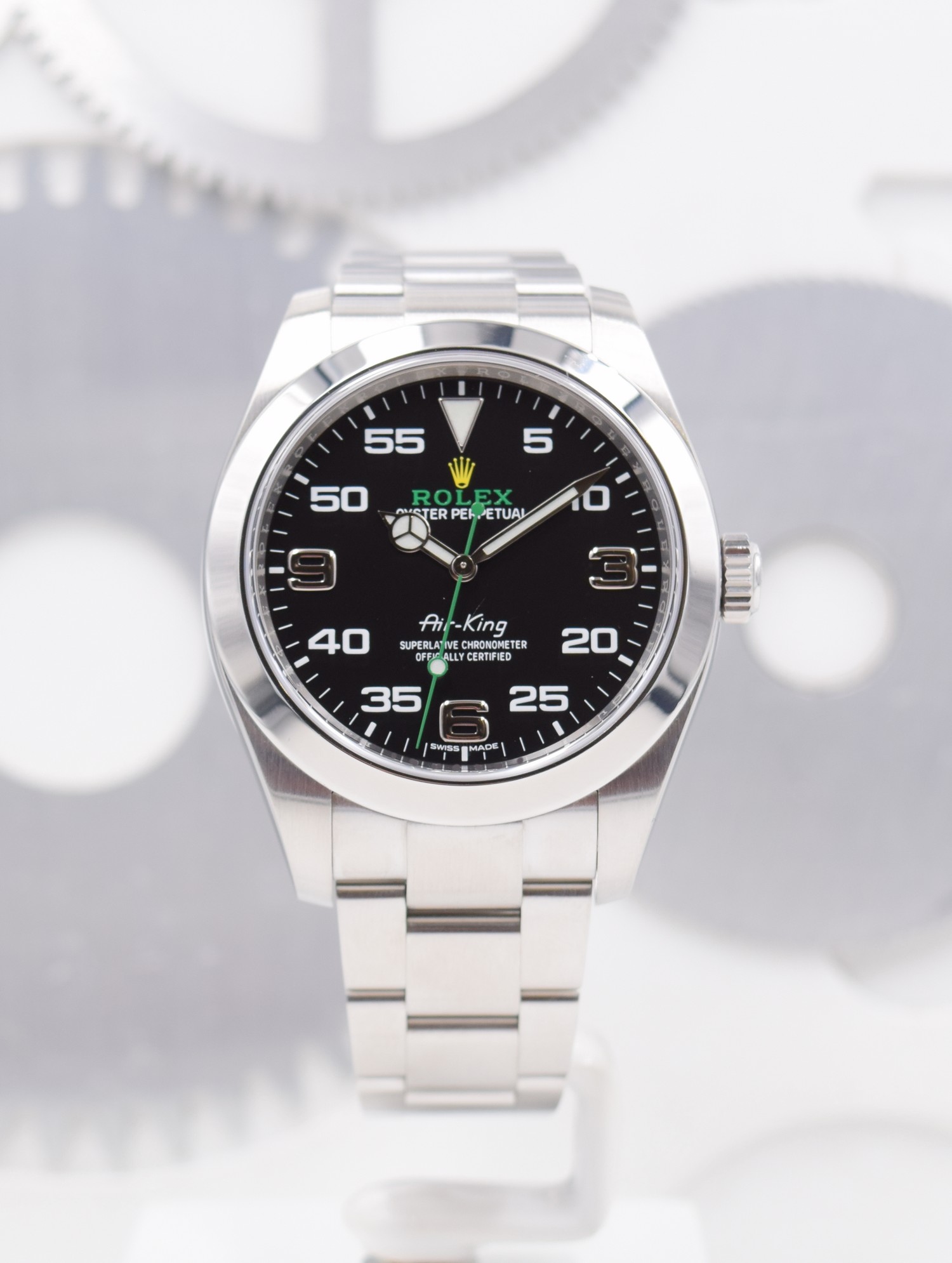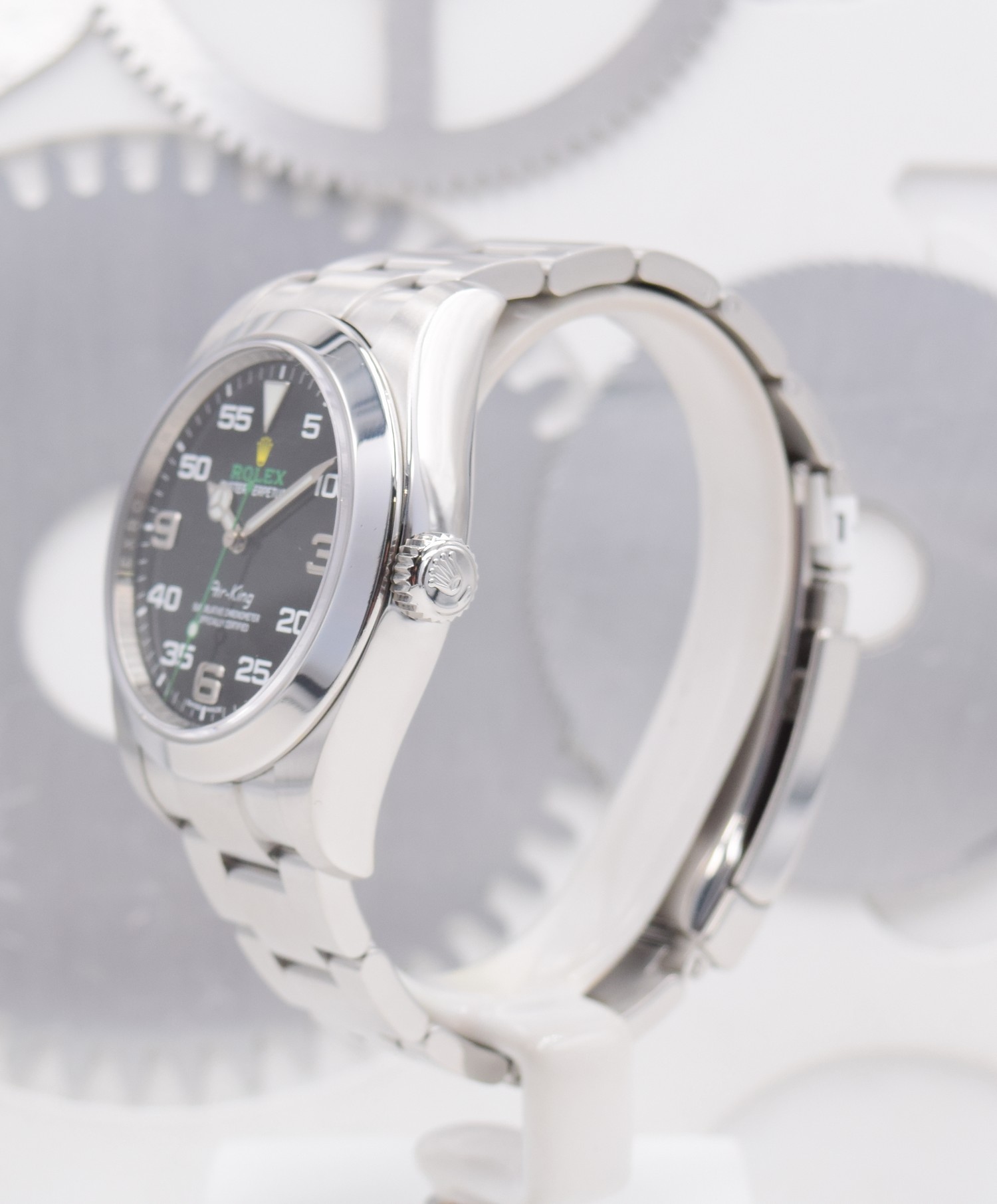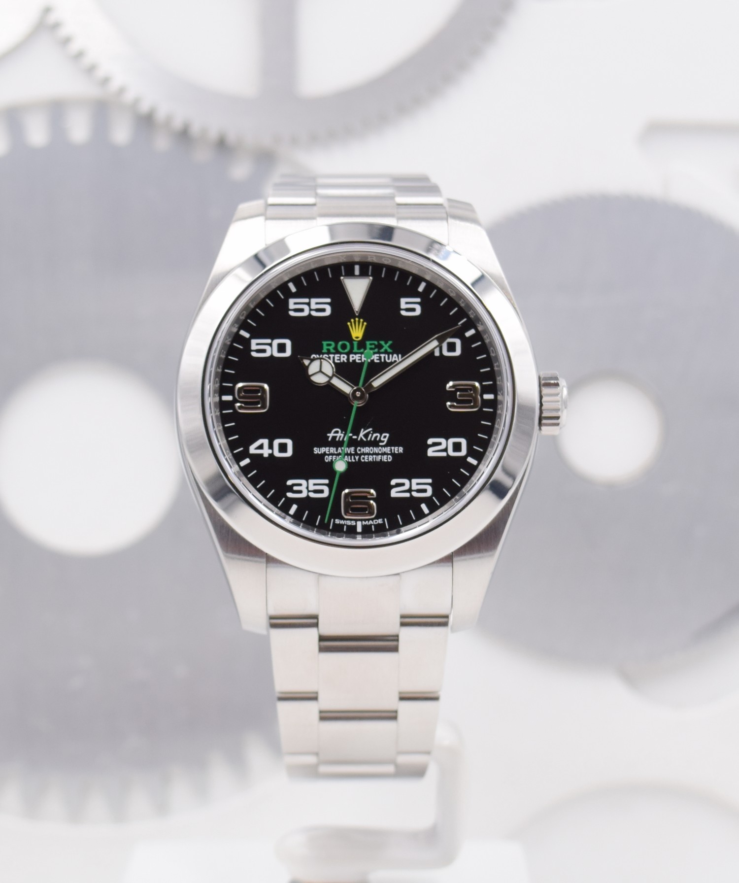 Rolex a produit un certain nombre de modèles « Air » pendant et immédiatement après la Seconde Guerre mondiale, tous pour la Royal Air Force britannique et ses pilotes. L’Air-King a été lancé en 1945. Son boîtier de 34 mm était considéré comme grand à l’époque, d’où le nom de « King ». À sa sortie, l’Air-King faisait partie d’une collection de montres Air qui comprenait les Air-Lion, Air-Tiger et Air-Giant, mais le règne des Air-Kings a surpassé les autres.