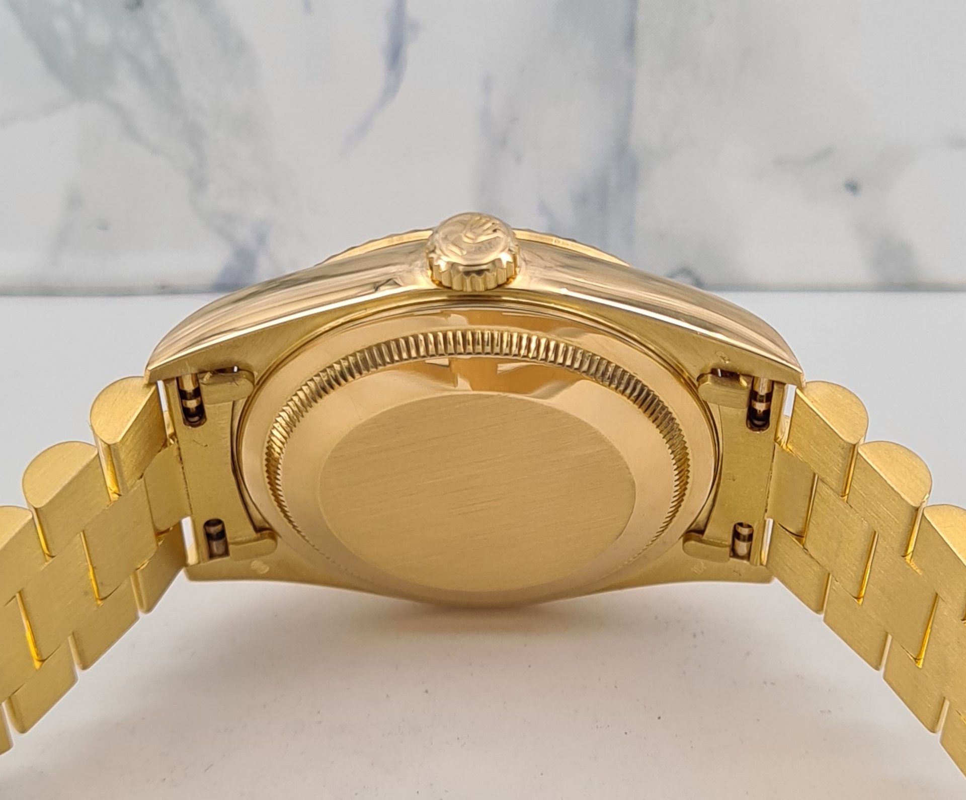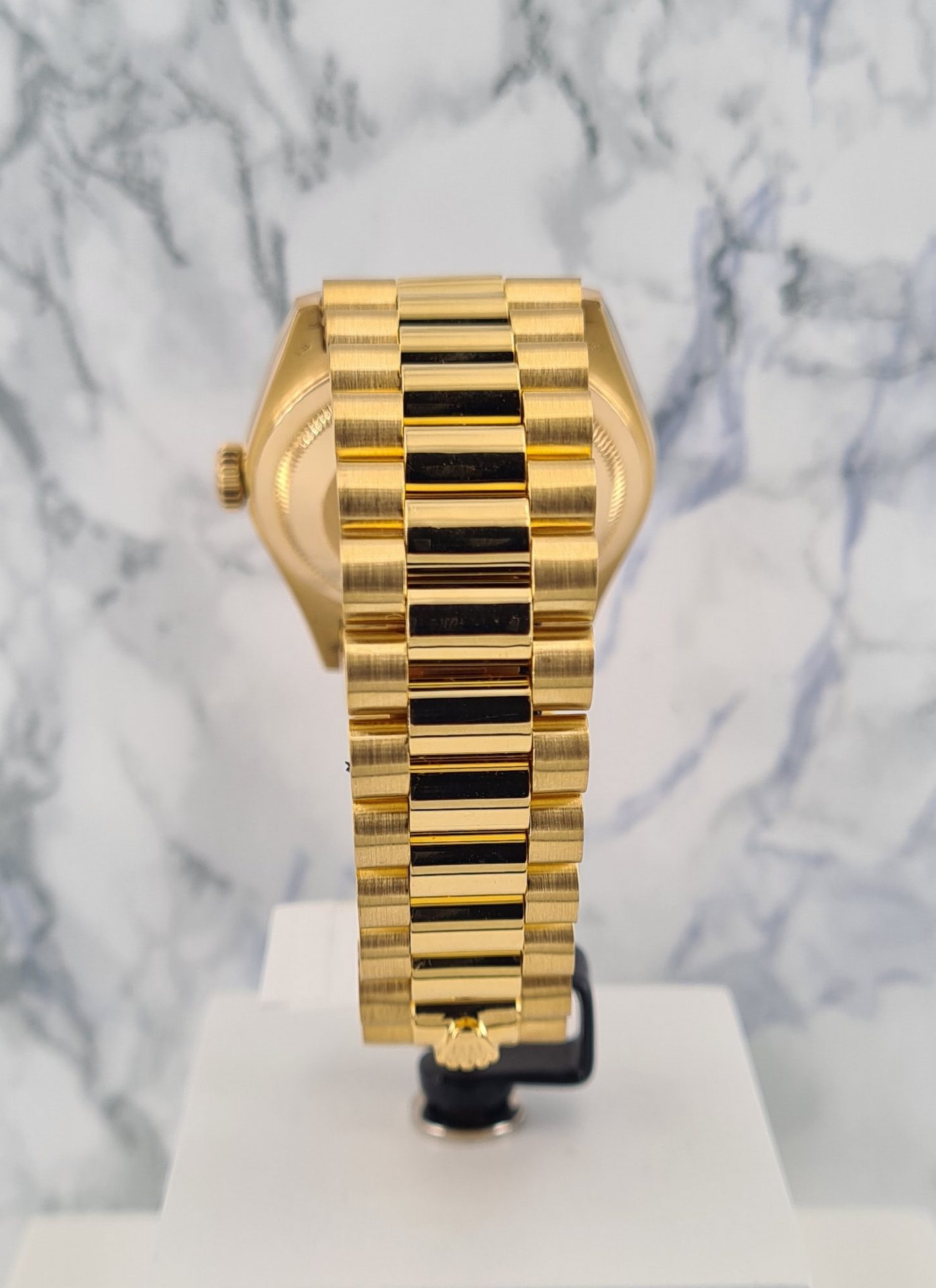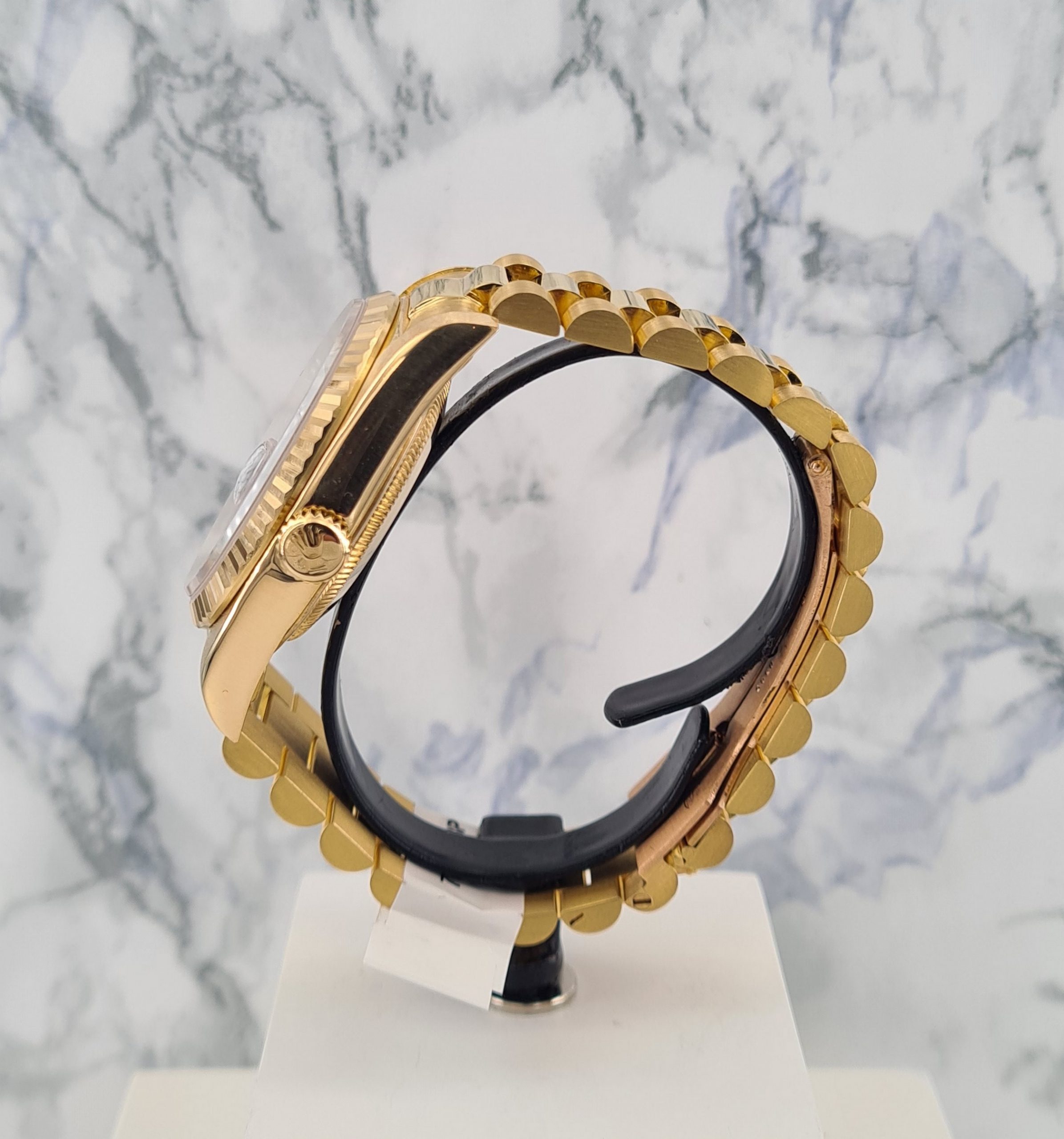 L’Oyster Perpetual Day‑Date 36 en Or Jaune, d’une lunette cannelée et d’un bracelet Président.