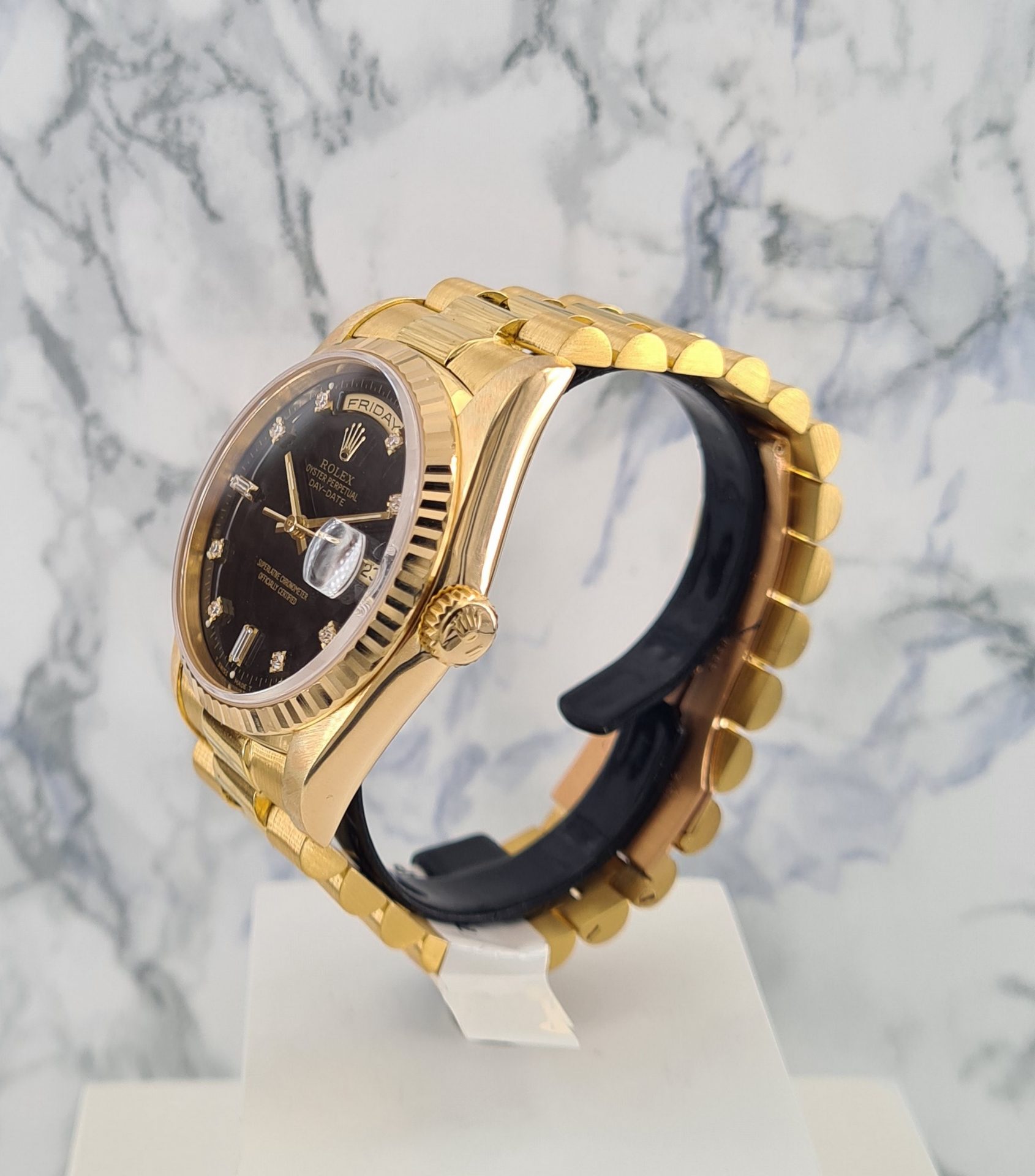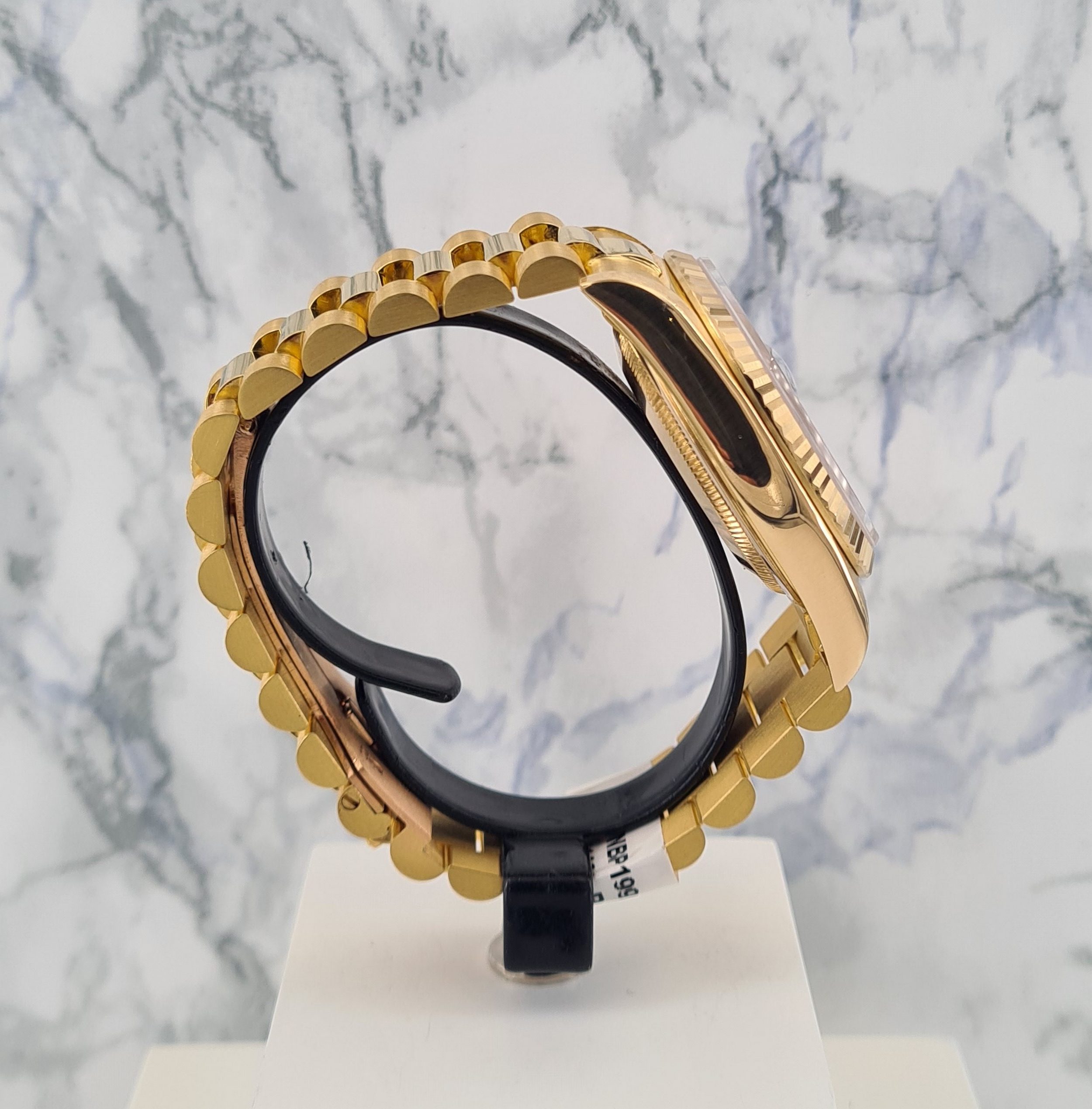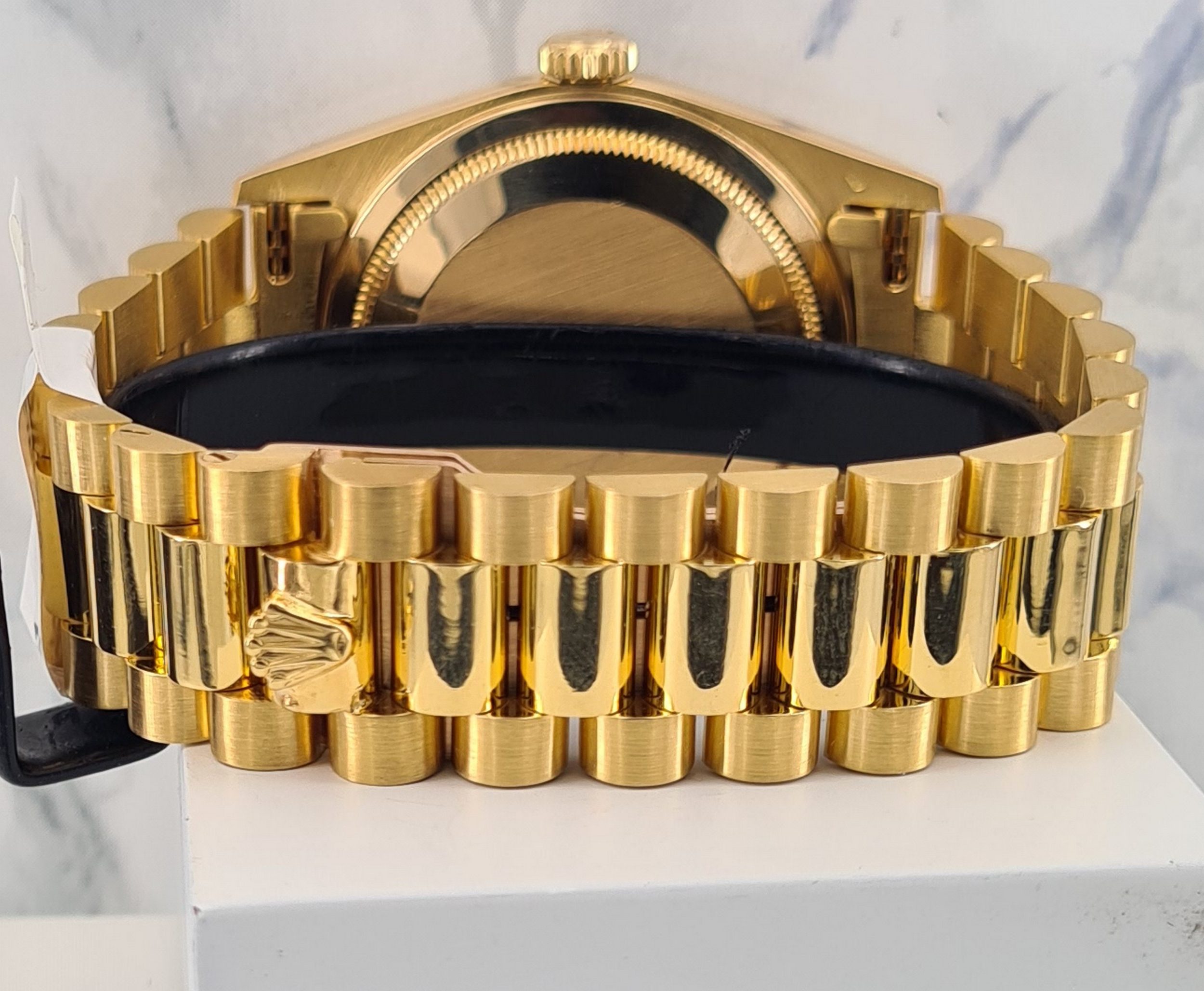 L’Oyster Perpetual Day‑Date 36 en Or Jaune, d’une lunette cannelée et d’un bracelet Président.